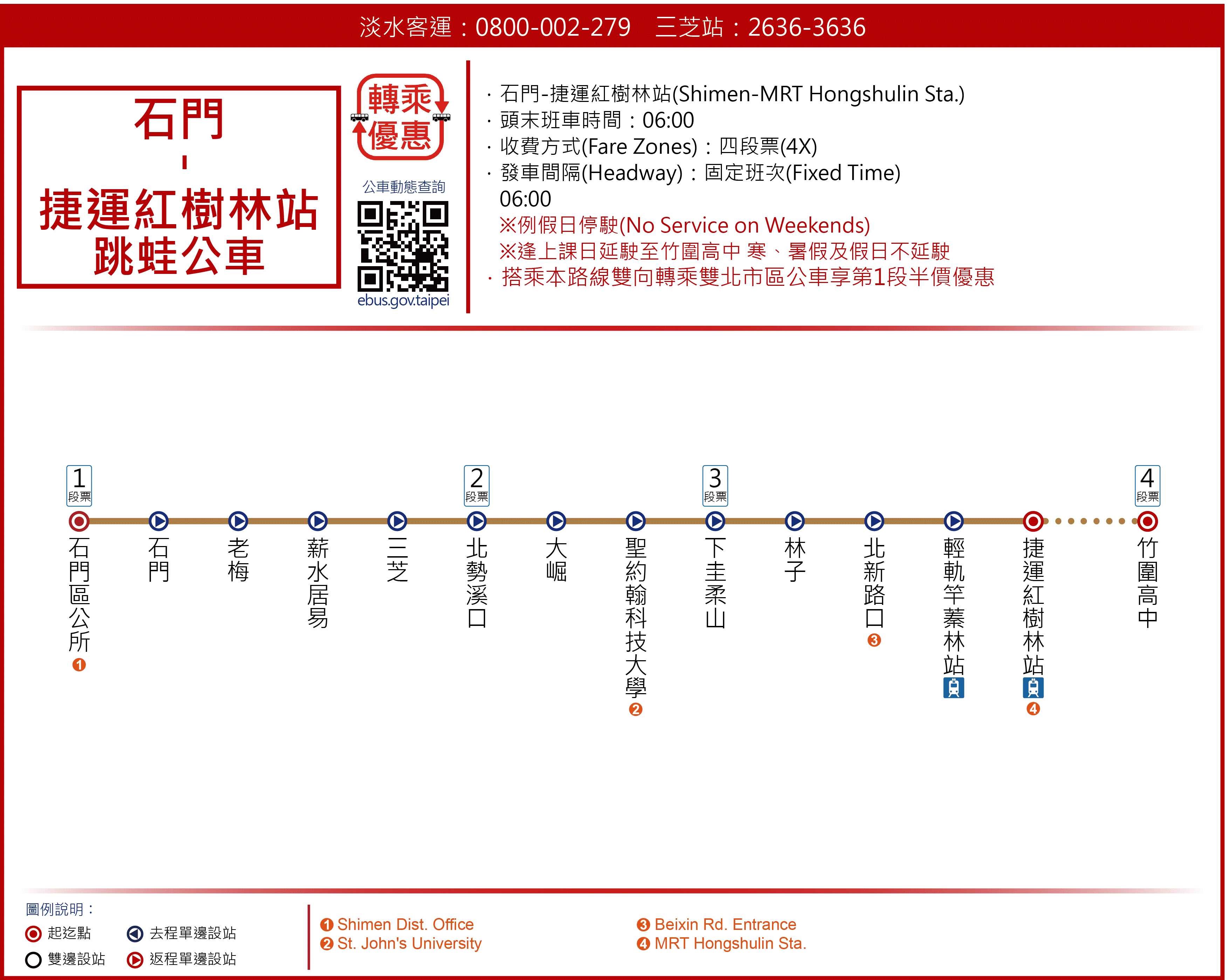 起迄站名 : 石門→捷運紅樹林站 固定班次(平日)6:00 (例假日停駛) 收費方式:4段票
